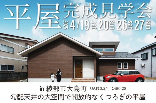 京都終了【完成見学会】綾部市大島町 4/19(土)~ 勾配天井の大空間で開放的なくつろぎの平屋