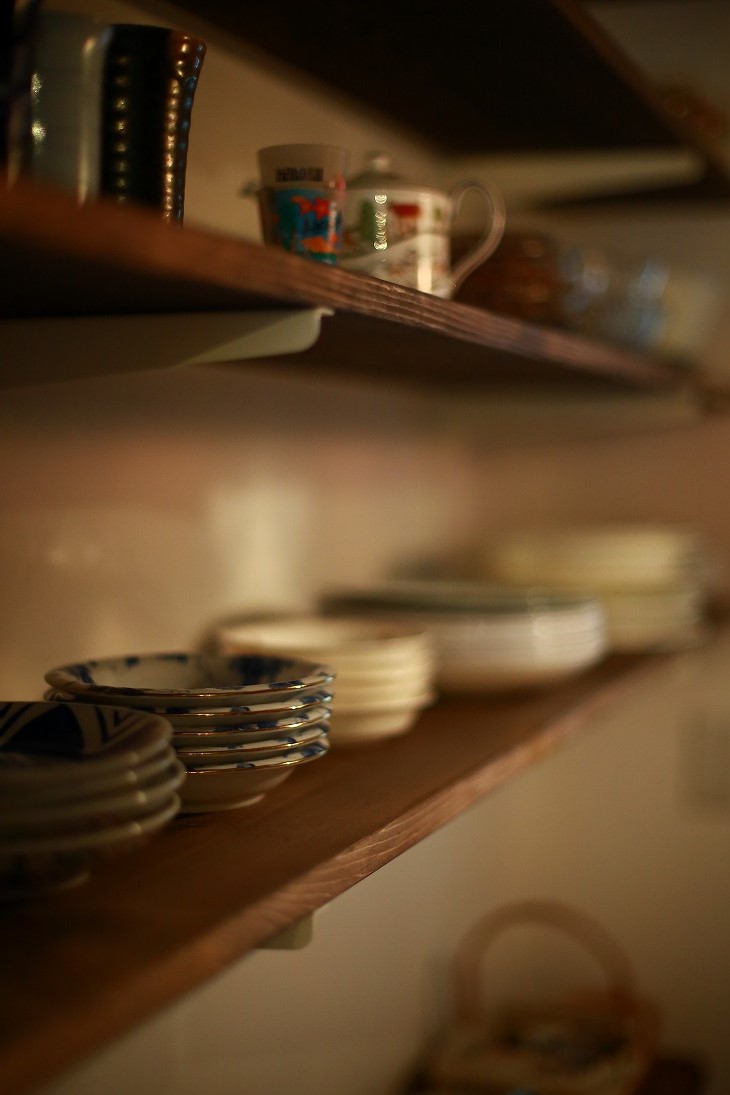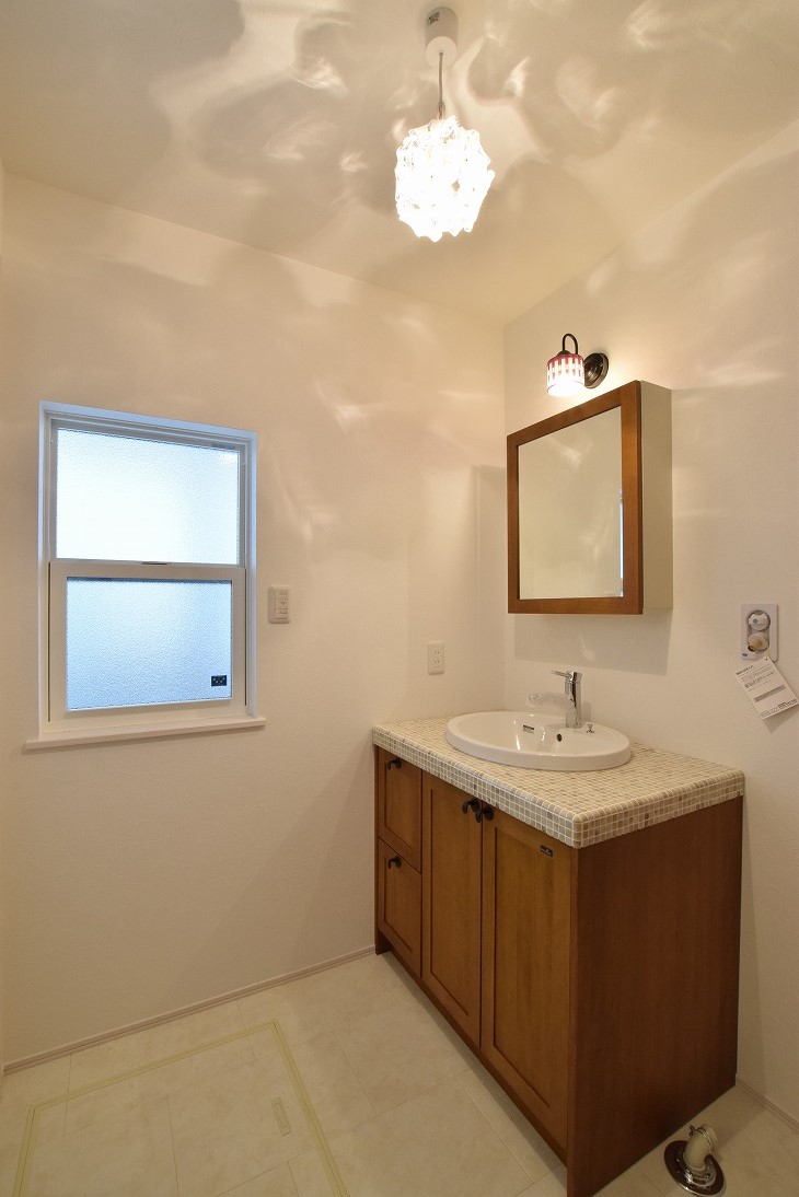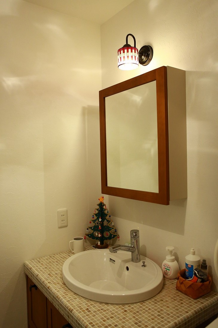 洗面にもこだわり、無垢の木の洗面台に陶器のボウル・タイル貼りのカウンターを組み合わせ素敵なスペースになりました。