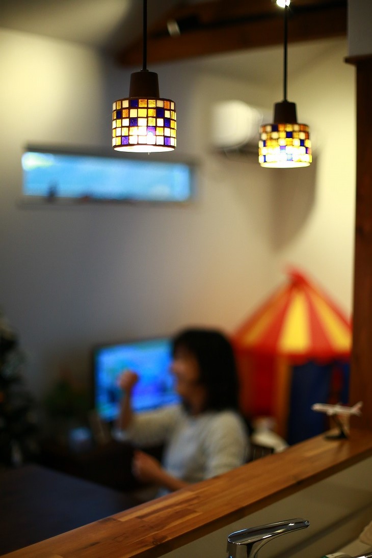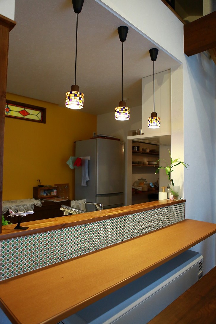 キッチンは、傷つきにくくお手入れのしやすい人工大理石のシンクや木の扉パネルで可愛く仕上げ、間接照明やステンドグラスでおしゃれな空間を演出!